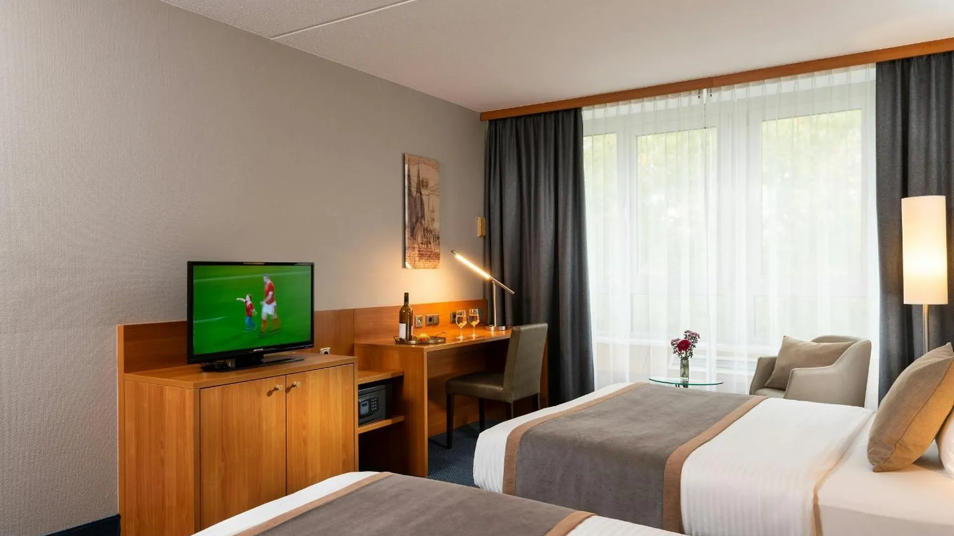 Die Zimmer im Leonardo Hotel Köln Bonn Airport überzeugen mit gemütlichem Komfort und einer modernen Ausstattung. Jedes der geräumigen Zimmer verfügt über einen 32-Zoll-Flachbild-HD-Fernseher, einen Schreibtisch und ein eigenes Badezimmer. Kostenfreies WLAN und ein Safe stehen ebenfalls zur Verfügung. Die Zimmer sind Nichtraucherzimmer und zeichnen sich durch eine klassische Einrichtung aus. Für beste Unterhaltung sorgt der mitgelieferte Flachbildfernseher, während das eigene Badezimmer mit Haartrockner sowie Kaffee- und Teezubereitungsmöglichkeiten jeden Morgen zu einem guten Start verhilft.